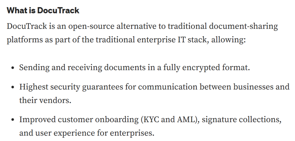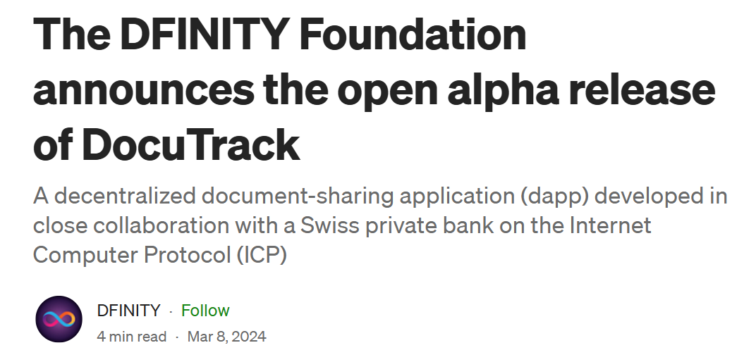 This year in March, DFINITY has announced the open alpha release of DocuTrack, an open-source, decentralized document-sharing application developed in collaboration with a Swiss private bank. DocuTrack offers fully encrypted document transmission, ensuring high security for business communications. It enhances customer onboarding processes, such as Know Your Customer (KYC) and Anti-Money Laundering (AML) procedures, and streamlines signature collection. Built on the Internet Computer blockchain, DocuTrack leverages chain-key cryptography and a threshold security scheme to maintain data privacy and integrity, with user data remaining encrypted during transit and processing.