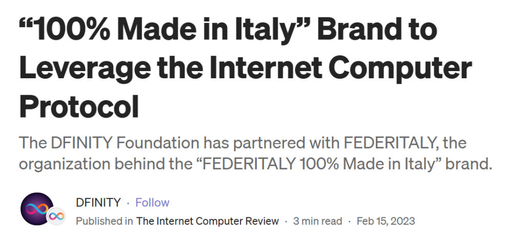 In 2023 the DFINITY Foundation has partnered with FEDERITALY, the organization behind the “FEDERITALY 100% Made in Italy” brand, to develop a decentralized application (Dapp) that enhances the certification process for authentic Italian products. This collaboration allows producers to apply for the “FEDERITALY 100% Made in Italy” label through a rigorous audit. Upon approval, a certificate is created on the Internet Computer blockchain, and a corresponding QR code is assigned to the product. Consumers can scan this QR code to access detailed information about the product, its producer, manufacturing process, materials, and certification, ensuring transparency and trustworthiness. This initiative aims to protect Italian entrepreneurship and showcase excellence globally by leveraging blockchain technology for secure and transparent verification.