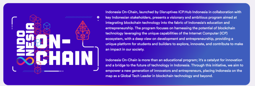 The mass adoption of ICP is also taking place in Indonesia. Indonesia On-Chain is an ambitious initiative launched by Disruptives ICP.Hub Indonesia in collaboration with key Indonesian stakeholders. The program aims to integrate blockchain technology into Indonesia’s education and entrepreneurship sectors, leveraging the unique capabilities of the Internet Computer (ICP) ecosystem. The initiative has garnered significant support, partnering with 75 high schools and 21 universities across Indonesia. This extensive collaboration underscores the program’s commitment to fostering a new generation of innovators and entrepreneurs, positioning Indonesia as a global leader in blockchain technology.